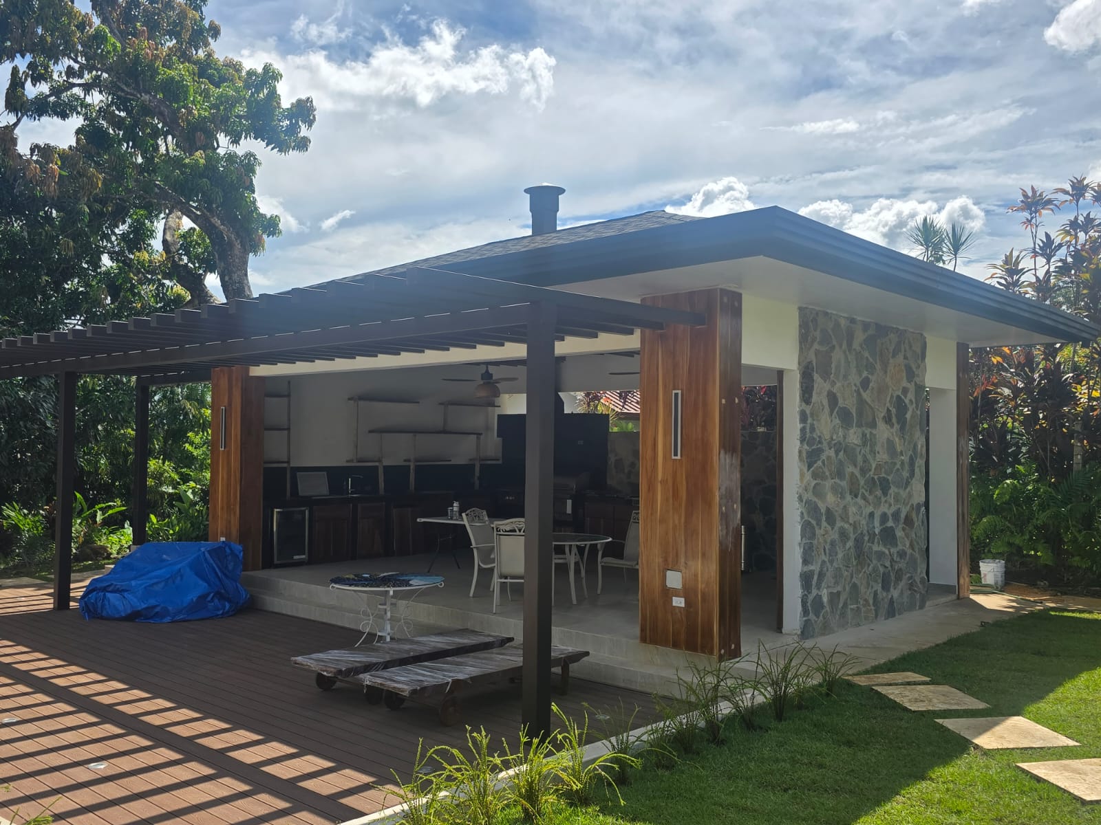 Proyecto de construccion completa desde cimientos hasta acabados, techo de teja tipo shingle, revestimientos de piedra, sobres de piedra sinterizada en color negro con asador empotrado, piso deck para exteriores, pergola en color grafito, iluminacion calidad para amrmonizar los espacios y un toque de madera de teca para un diseño elegante.